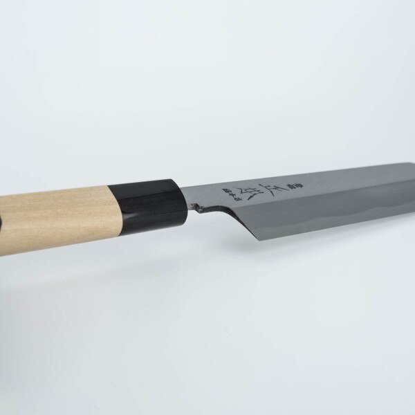 The Masamoto Shiro-ko Hongasumi knives are forged in Japan from a combination of white carbon steel #2 and soft iron steel, and handled with magnolia wood and a water buffalo bolster. White steel’s pure carbon content allows for the sharpest cutting edge. The main difference between the kasumi and hongasumi line is found in the crafting process. More steps, higher level craftsman, and greater attention to detail are involved when crafting hongasumi knives, and they therefore are more refined than kasumi knives.
